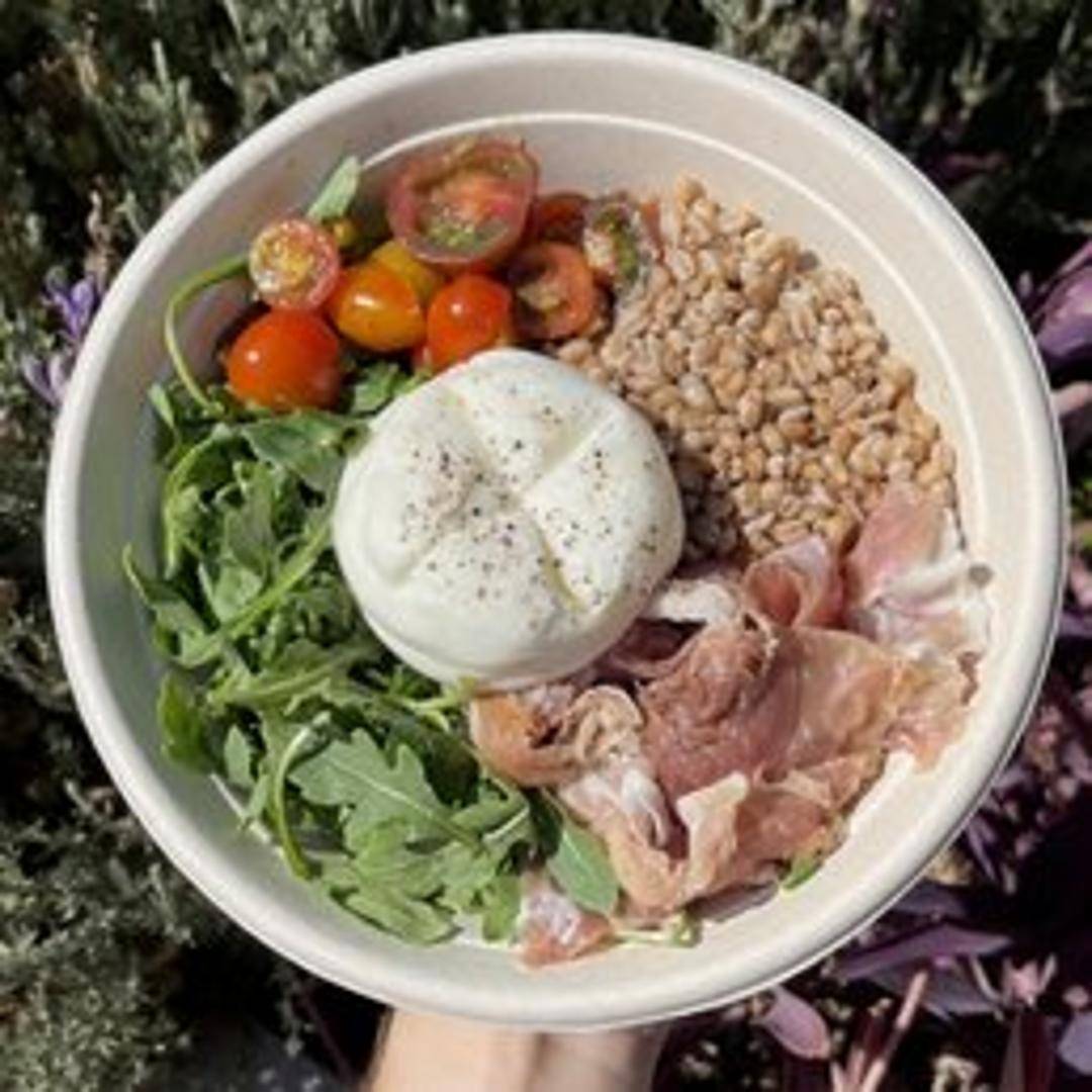 A refreshing bowl centered around fresh burrata, complemented by mixed greens, cherry tomatoes, roasted bell peppers, and a light vinaigrette dressing.