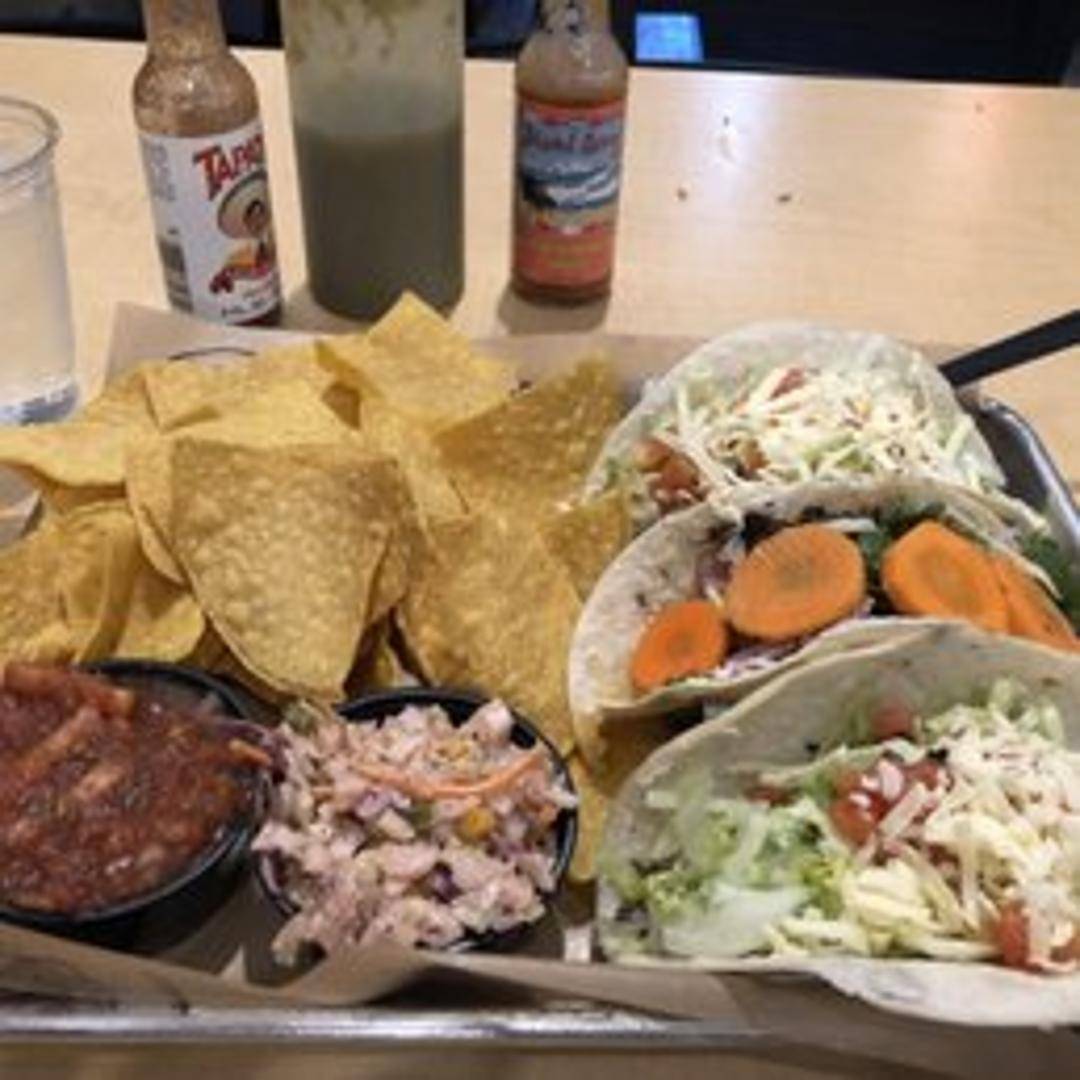 Two soft tacos filled with grilled or fried shrimp (preparation may vary based on daily offering), shredded cabbage, pico de gallo, and a creamy sauce. Served with a side of chips and salsa.