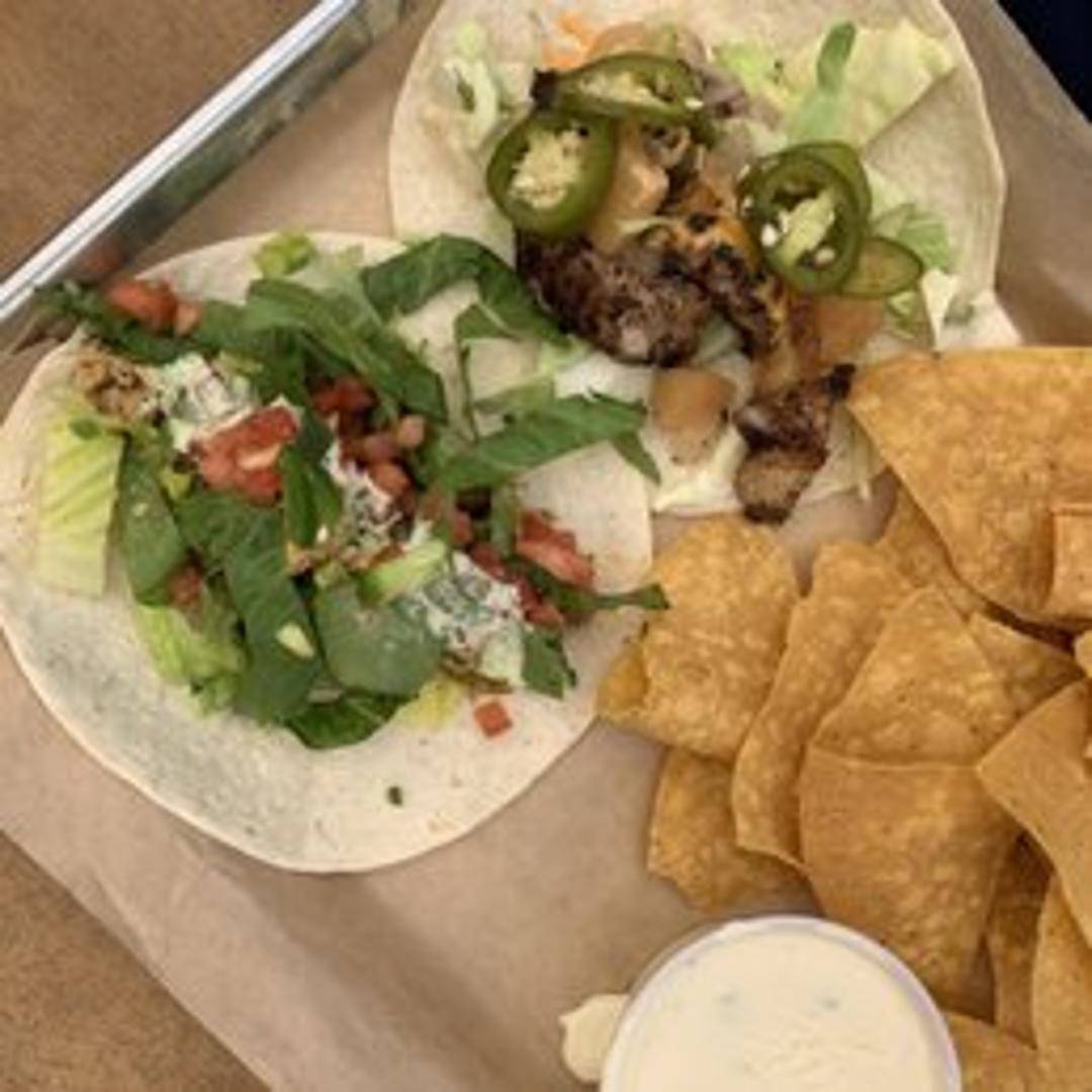 Two soft tacos filled with flaky fish, shredded cabbage, pico de gallo, and a creamy cilantro lime sauce. Served with a side of chips and salsa.