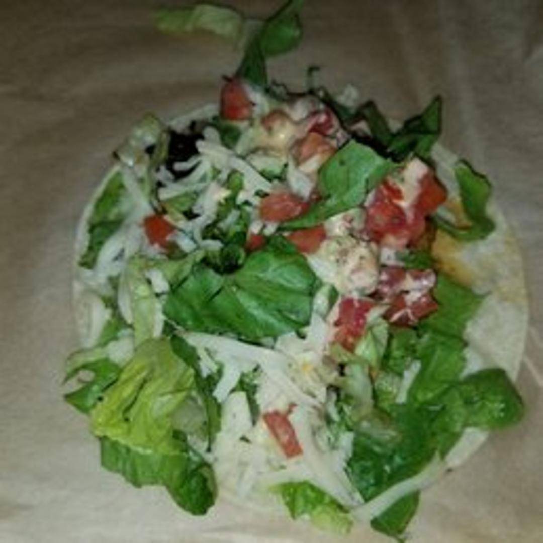 Two grilled flour tortillas filled with jumbo shrimp, shredded cabbage, pico de gallo, and a creamy baja sauce.
