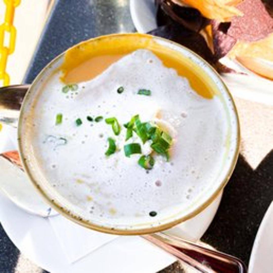 Creamy and smooth butternut squash soup, often seasoned with warming spices like cinnamon and nutmeg. Garnished with toasted pumpkin seeds or a swirl of cream.