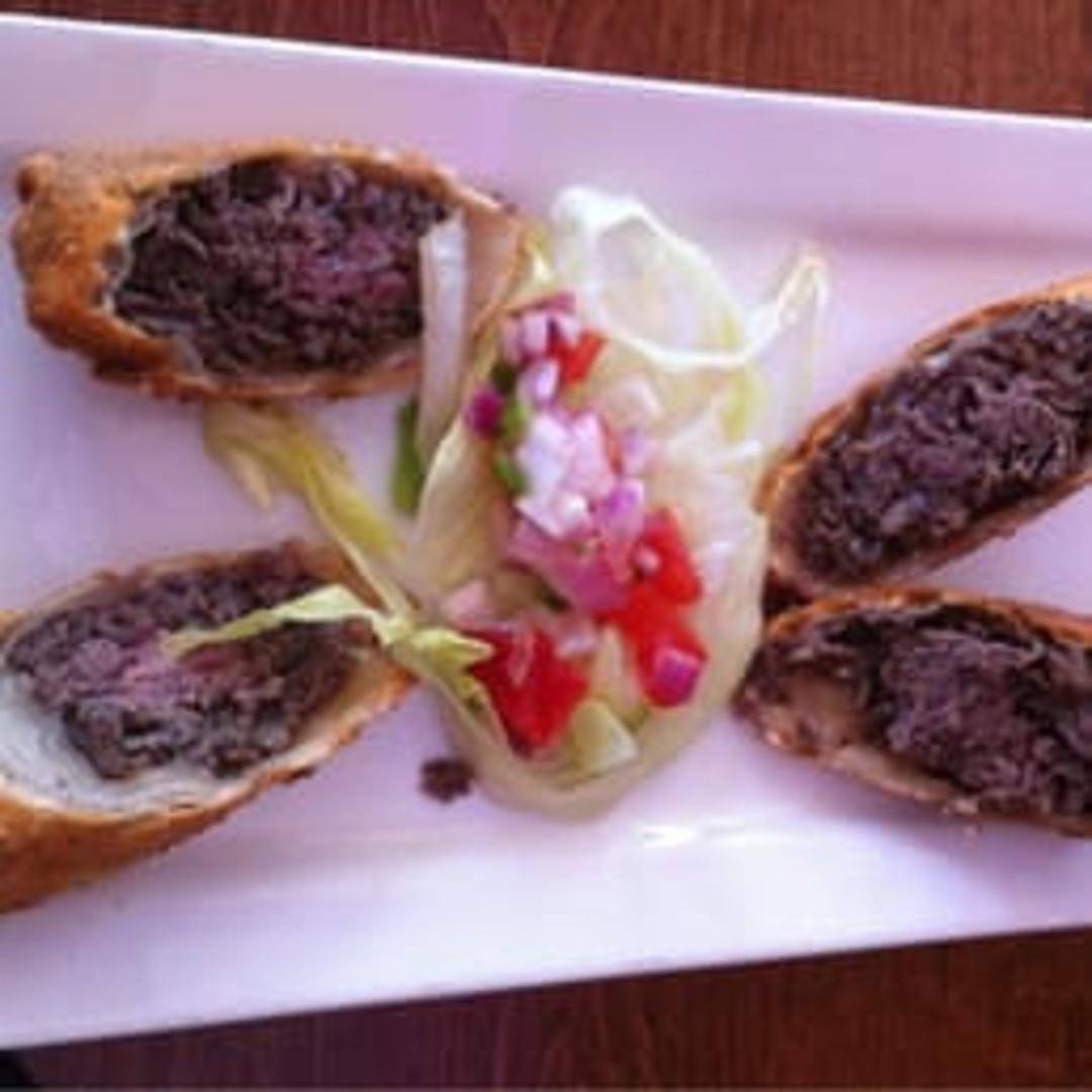 Thinly sliced steak, caramelized onions, and cheese blend, rolled in a crispy spring roll wrapper. Served with a spicy ketchup for dipping.