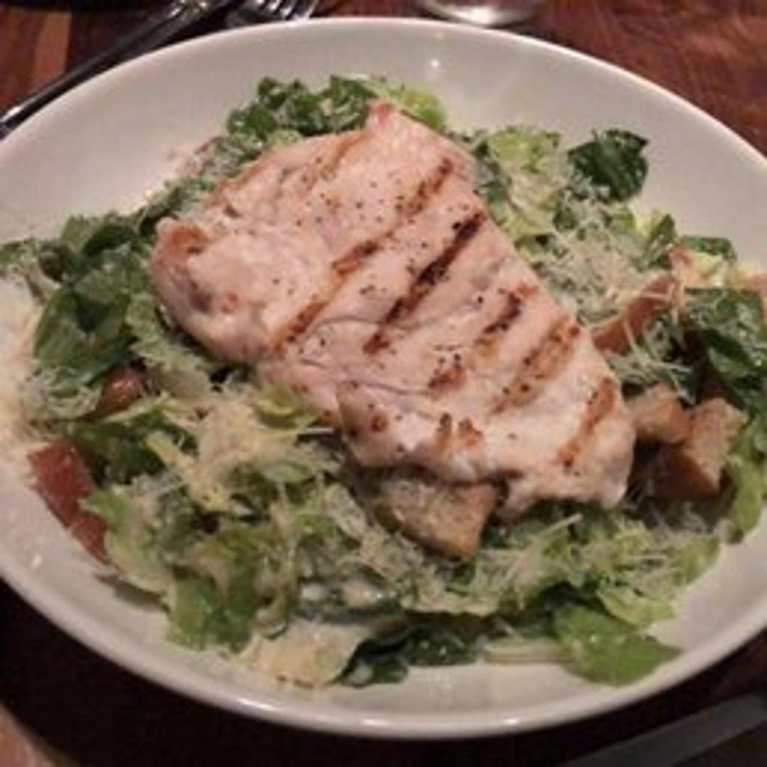 Grilled or crispy chicken breast (specify preference upon ordering) served atop romaine lettuce tossed in creamy Caesar dressing with croutons and shaved Parmesan cheese.