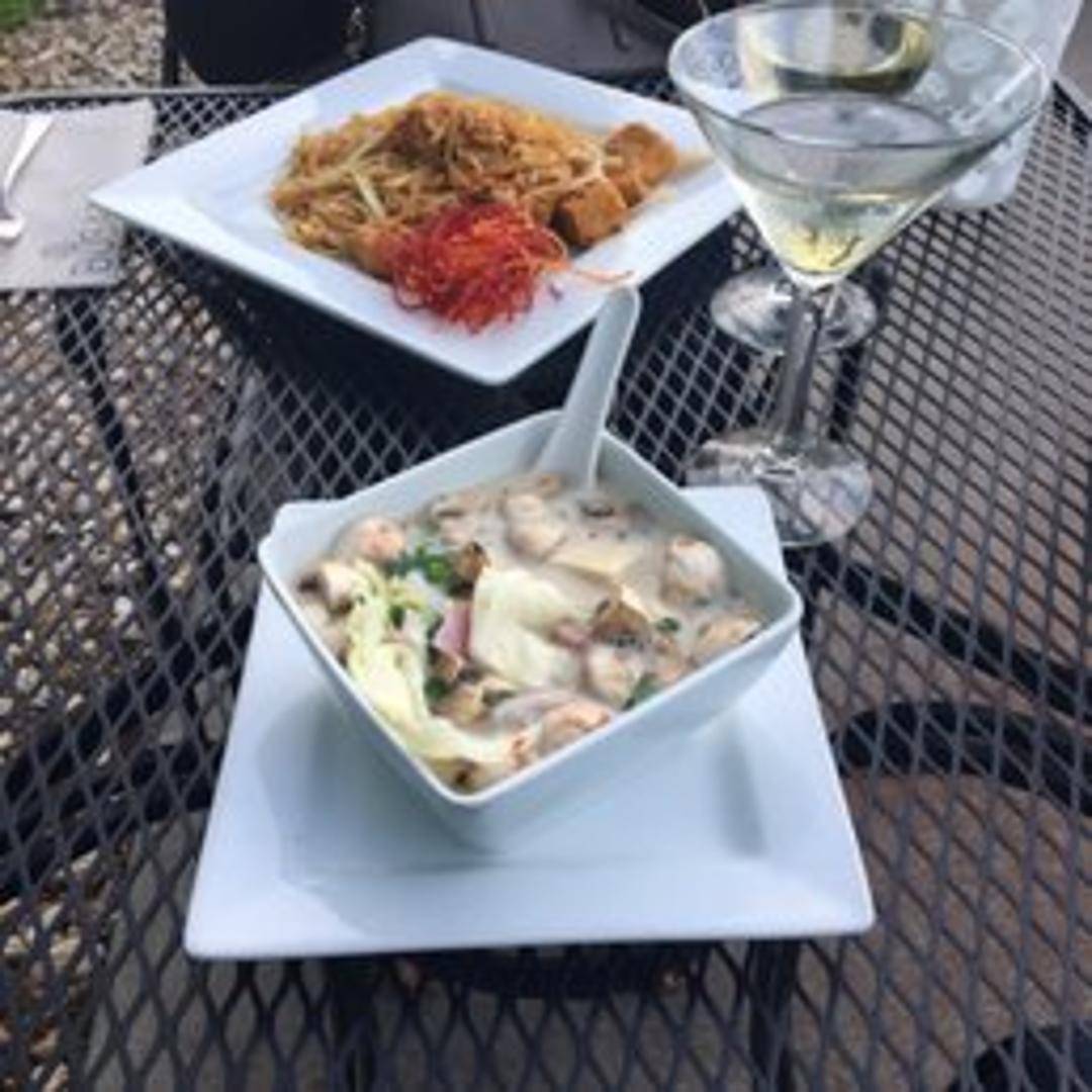 A creamy and aromatic coconut milk soup flavored with galangal, lemongrass, kaffir lime leaves, mushrooms, tomatoes, and your choice of protein (tofu, chicken, shrimp, or vegetables). Topped with cilantro.