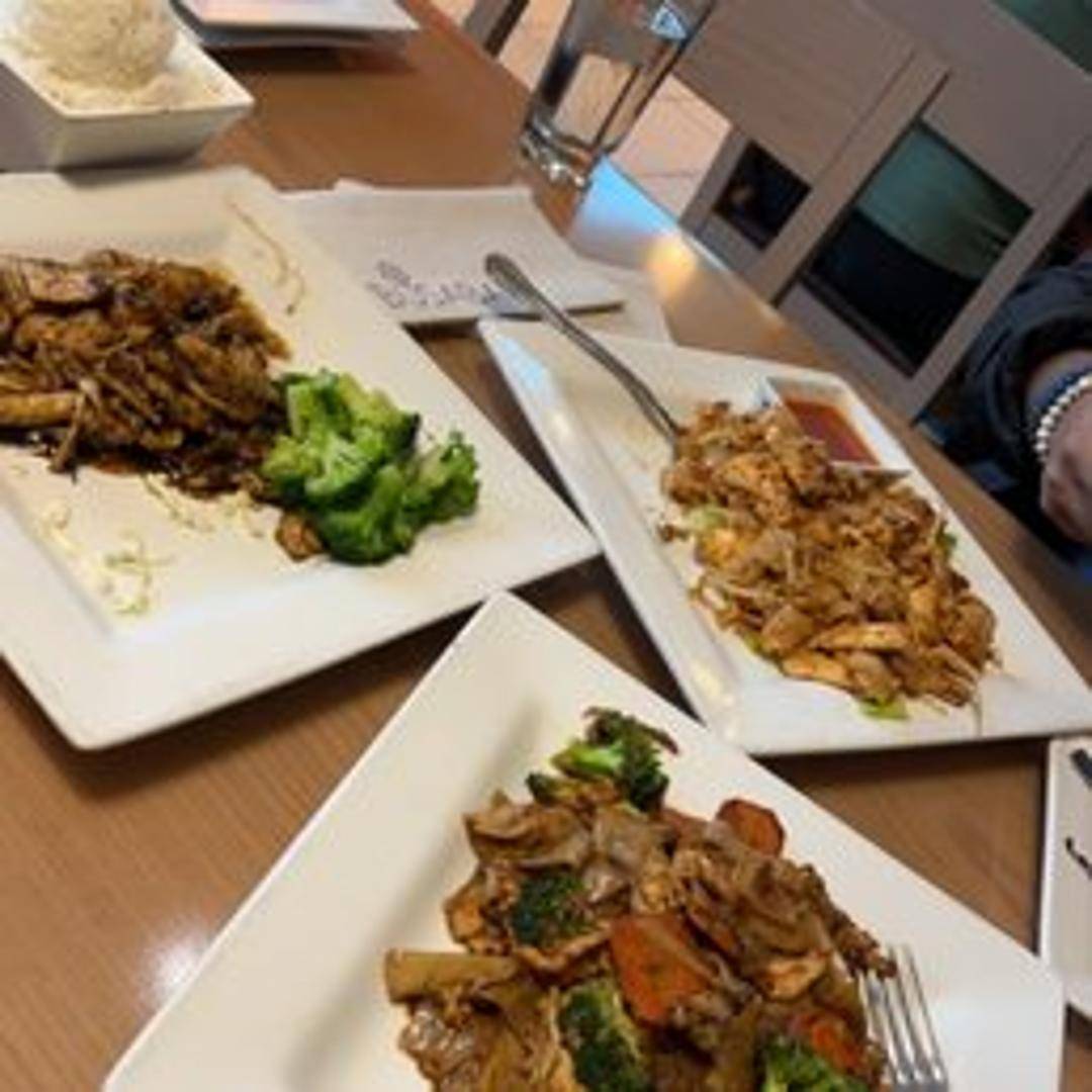 Wide rice noodles stir-fried with egg, broccoli, carrots, and a sweet soy sauce. Choice of protein (tofu, chicken, beef, shrimp, or vegetables).