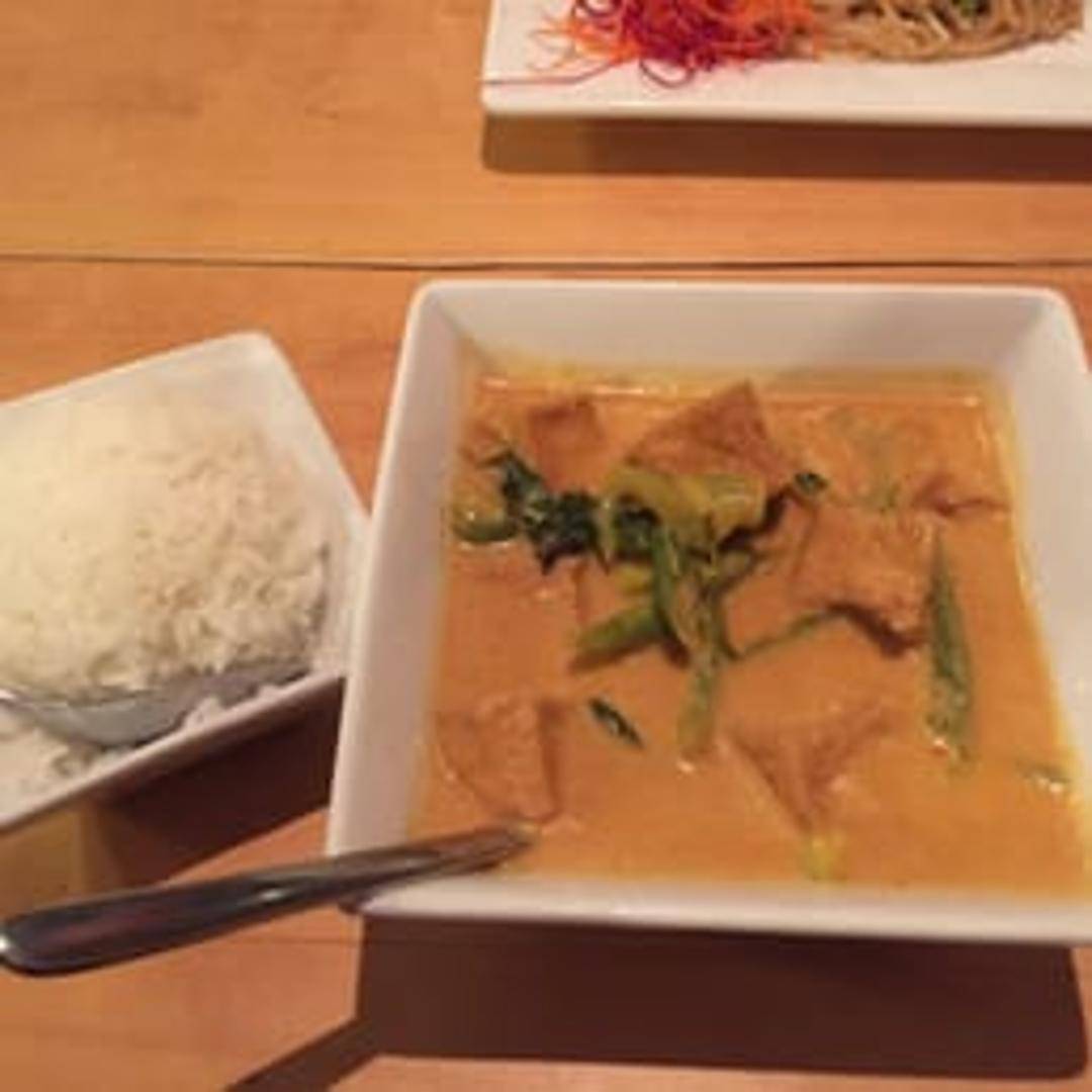 A rich and creamy curry, slightly sweeter and milder than red curry, made with Panang curry paste, coconut milk, bell peppers, kaffir lime leaves, and your choice of protein (tofu, chicken, beef, shrimp, or vegetables).