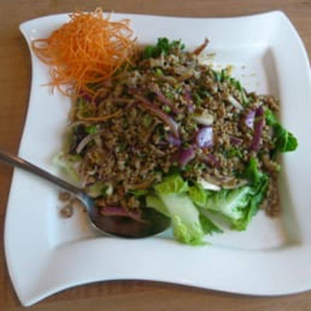 A flavorful and herbaceous minced meat salad (usually chicken or pork) seasoned with lime juice, fish sauce, toasted rice powder, chili flakes, and fresh herbs like mint, cilantro, and shallots. Served with lettuce wraps.
