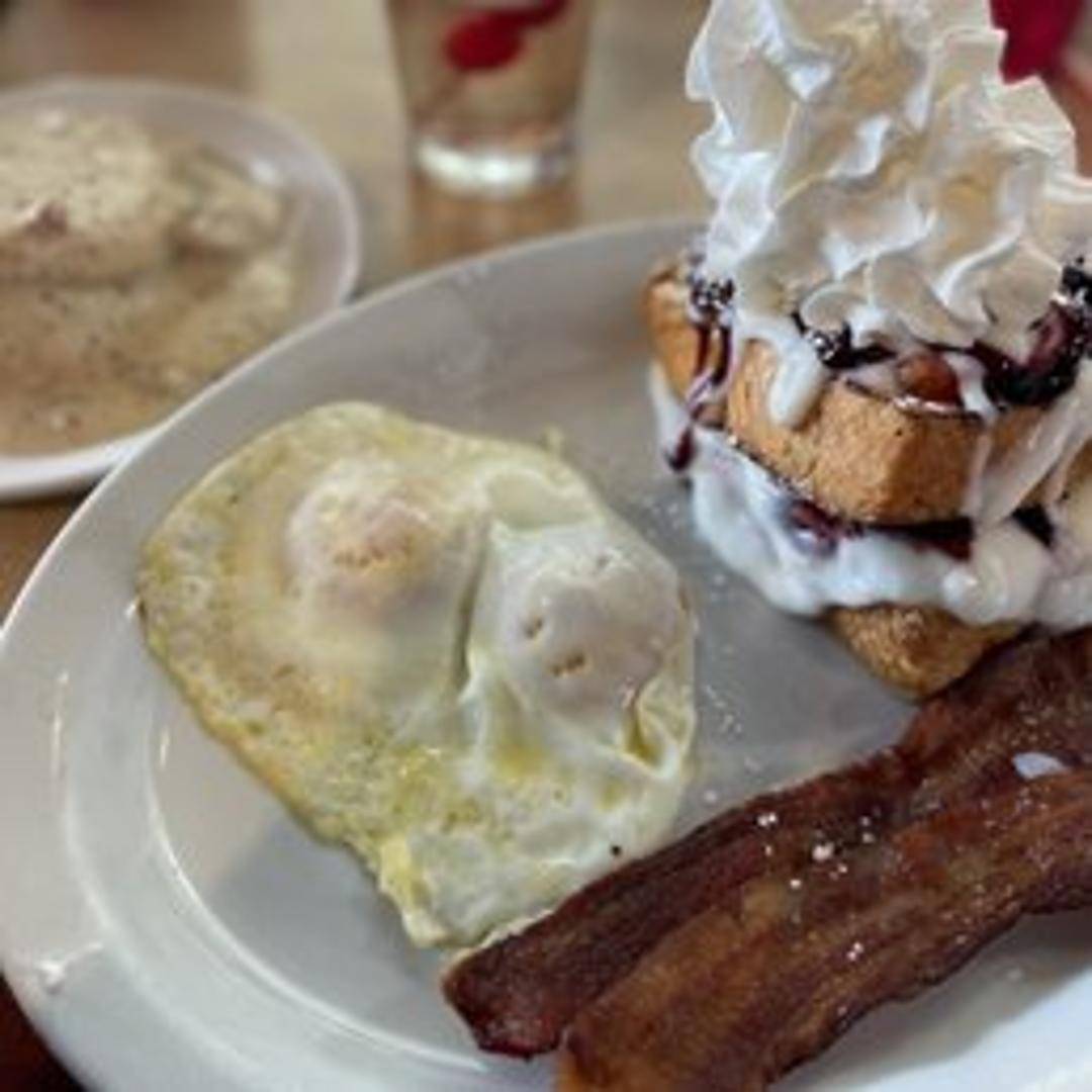 Classic French toast made with thick-cut bread, dipped in a rich batter and grilled to golden perfection. Served with a side of syrup and dusted with powdered sugar.
