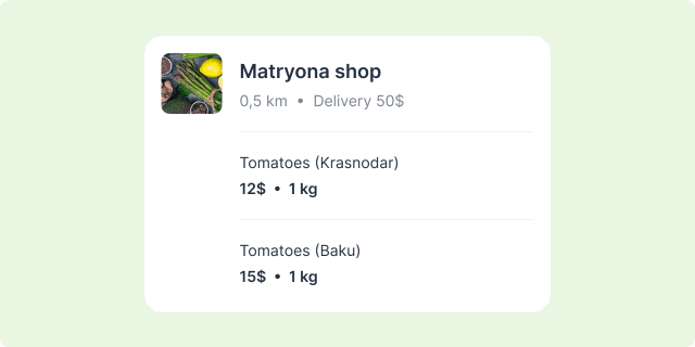 You may easily and quickly find the products via the search option. To do this, just enter the product description or a keyword in the text search line. For instance, the query «meat» will display offers of farm shops with fresh meat, grocery stores where you can buy sausages and other meat products, as well as restaurants and cafes where you can order ready-made meals related to meat.