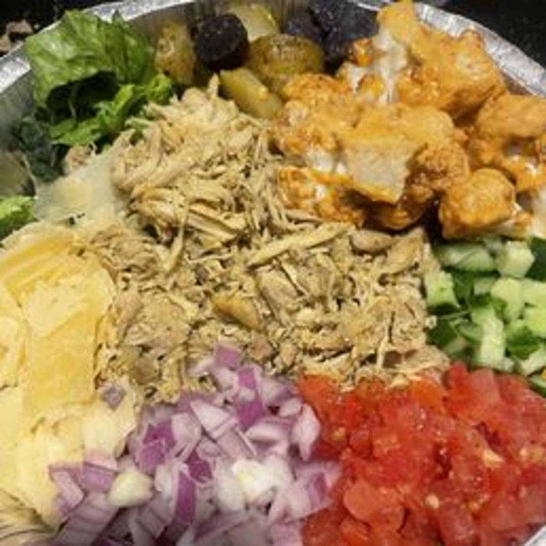 A flavorful bowl featuring your choice of protein (rotisserie chicken, falafel, or roasted vegetables), served over a bed of grains, hummus, chopped vegetables, olives, feta cheese, and a lemon-herb vinaigrette.