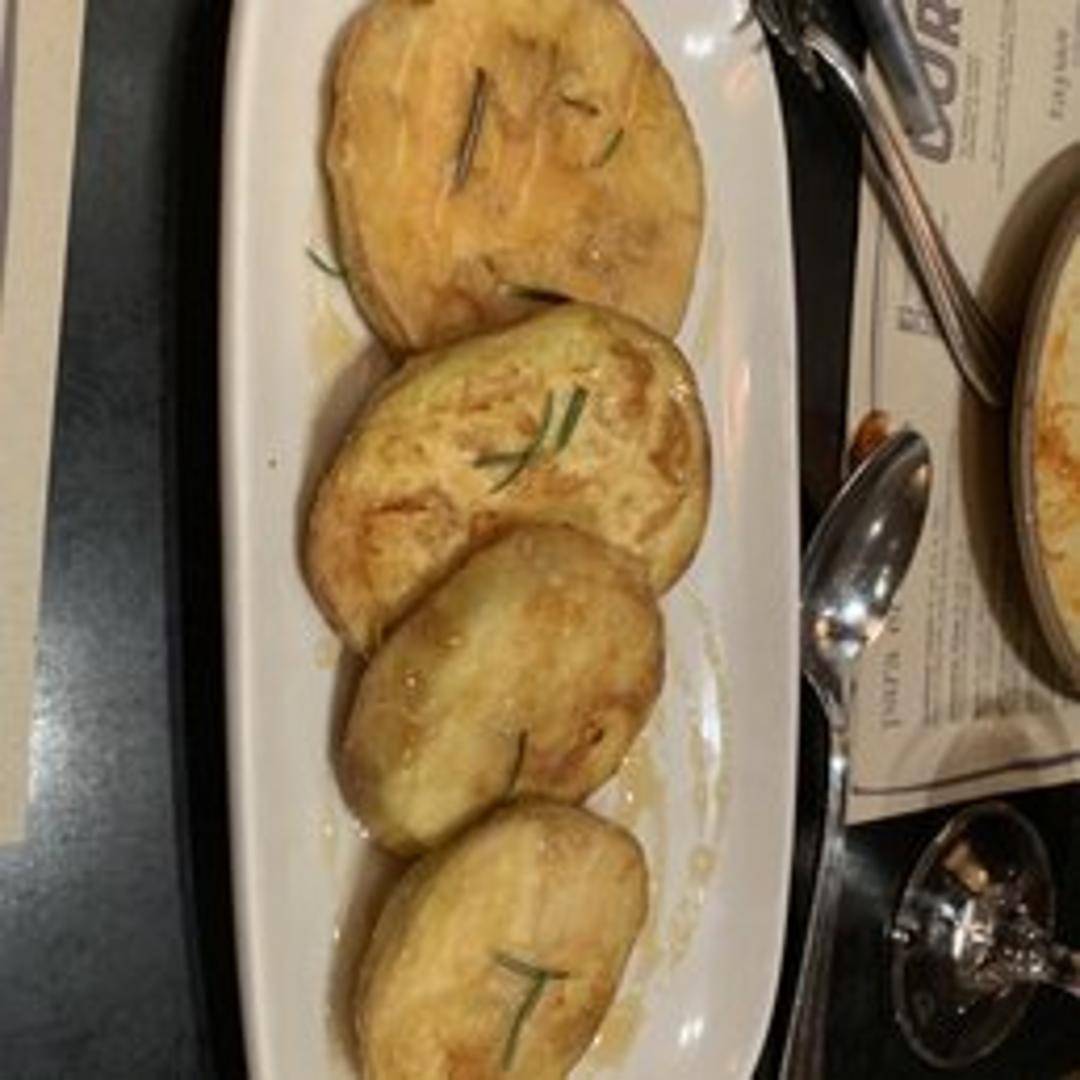 Thinly sliced and perfectly fried eggplant drizzled with honey. It's a delightful combination of crispy, sweet, and savory flavors, offering a unique and addictive appetizer or side dish. The honey complements the eggplant's natural sweetness and creates a balanced and delicious taste.