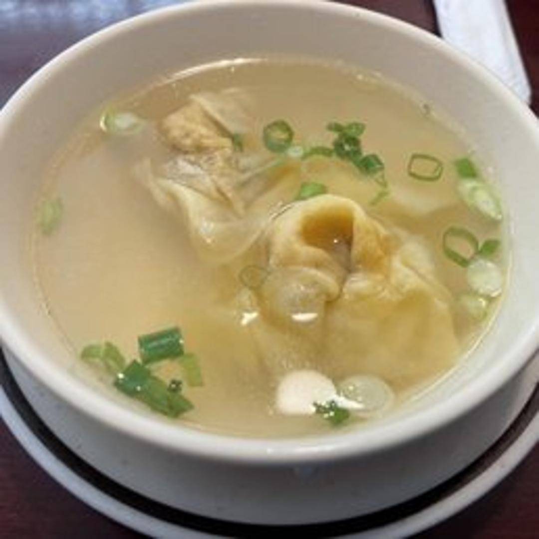 A comforting and classic Chinese soup featuring delicate, handmade wontons filled with a savory blend of seasoned meat, all served in a light, clear, and flavorful broth. A perfect warm start to any meal.
