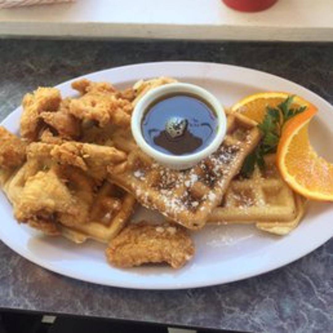 Crispy fried chicken served atop fluffy, golden waffles. Includes a side of sweet maple syrup and butter for a satisfying sweet and savory breakfast or brunch experience.