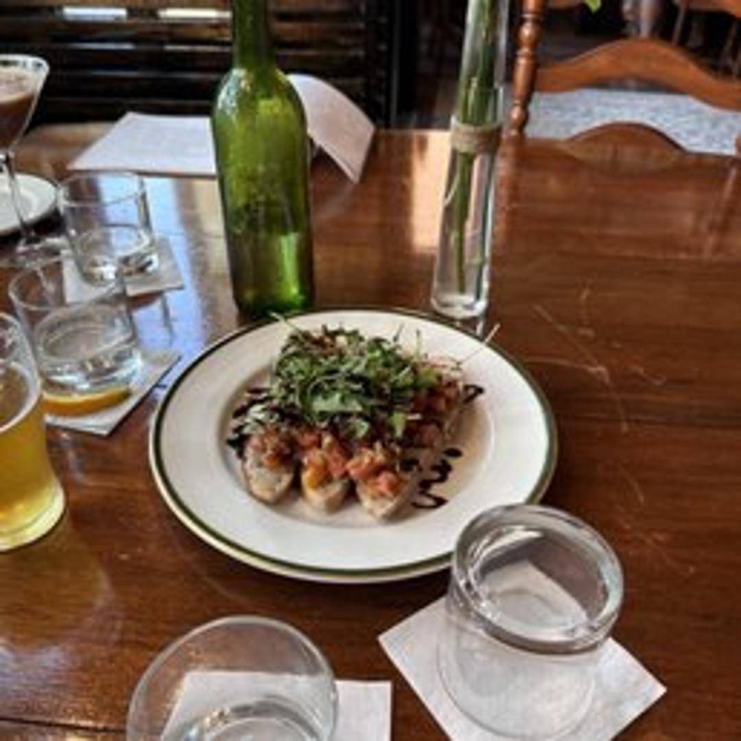 Toasted slices of artisanal bread topped with a vibrant mixture of fresh diced tomatoes, garlic, basil, and a drizzle of olive oil. A simple yet flavorful appetizer showcasing the freshness of the ingredients.