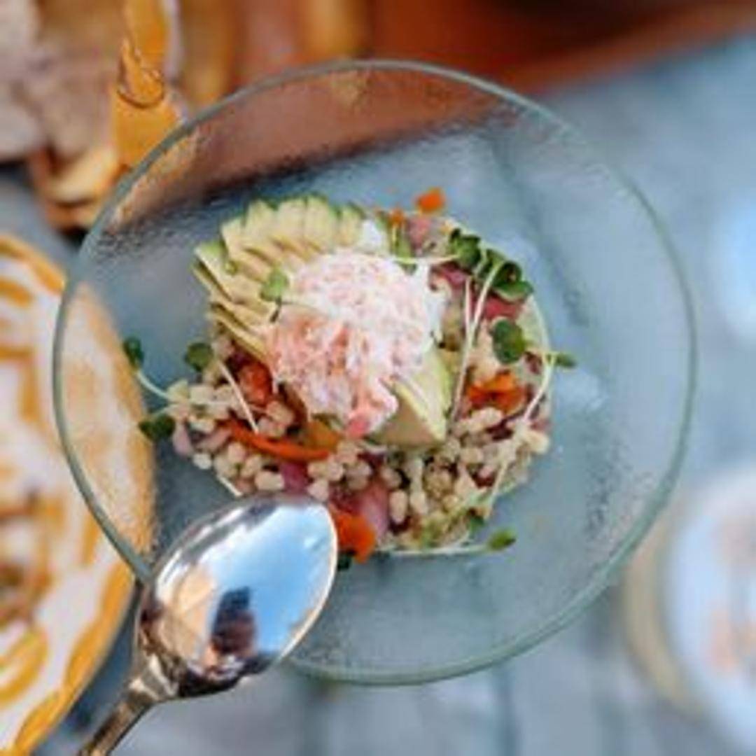 A layered Peruvian dish featuring whipped potato, avocado, and aji amarillo, topped with your choice of filling. A vibrant and refreshing appetizer.