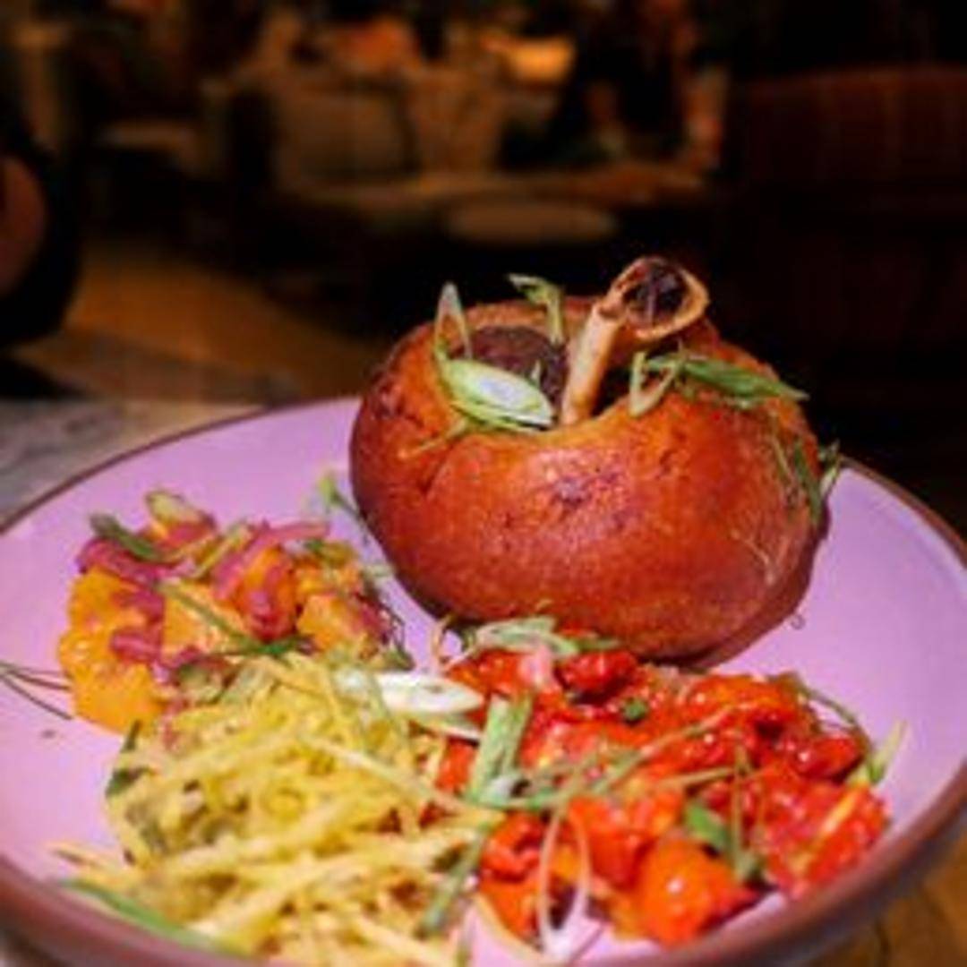 Slow-cooked pork shank, fried until crispy, and served with a flavorful dipping sauce and pickled onions.