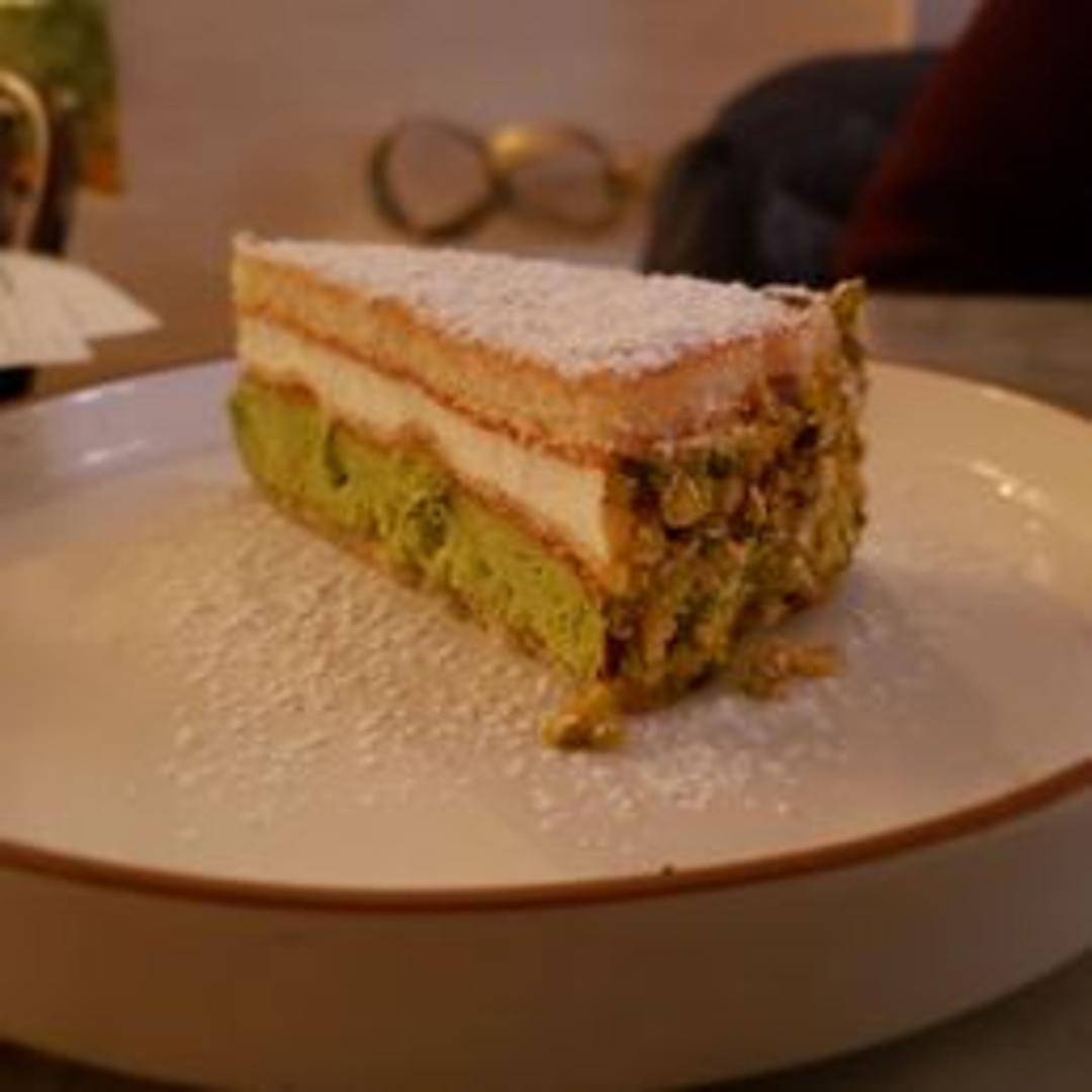 A delicate and moist layered cake featuring the nutty richness of pistachio and the creamy smoothness of ricotta cheese. Each layer is perfectly balanced, offering a symphony of textures and flavors. Finished with a light dusting of powdered sugar.