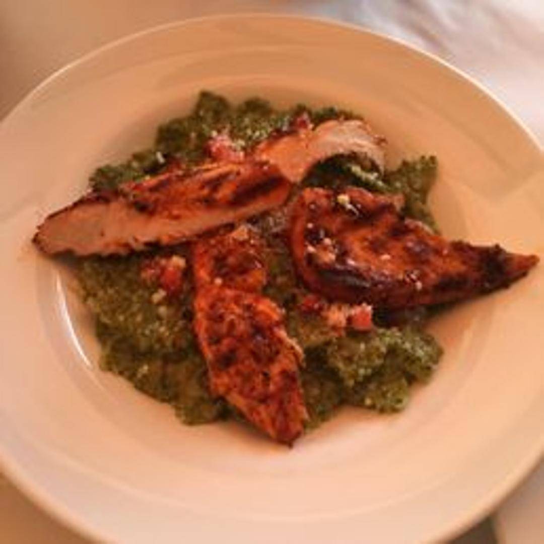 Experience a classic Italian-inspired pasta dish featuring delicate farfalle (bow-tie) pasta tossed in a vibrant, aromatic pesto sauce made with fresh basil, pine nuts, garlic, Parmesan, and olive oil. This flavorful pasta is perfectly complemented by tender, seasoned pieces of grilled or roasted chicken, creating a hearty and satisfying meal.