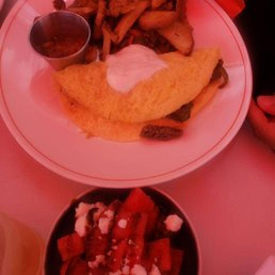 A savory and hearty omelet packed with tender strips of seasoned grilled steak, sautéed bell peppers, and caramelized onions, all folded into fluffy eggs with a generous helping of melted Monterey Jack cheese. Served with a side of crispy home fries.