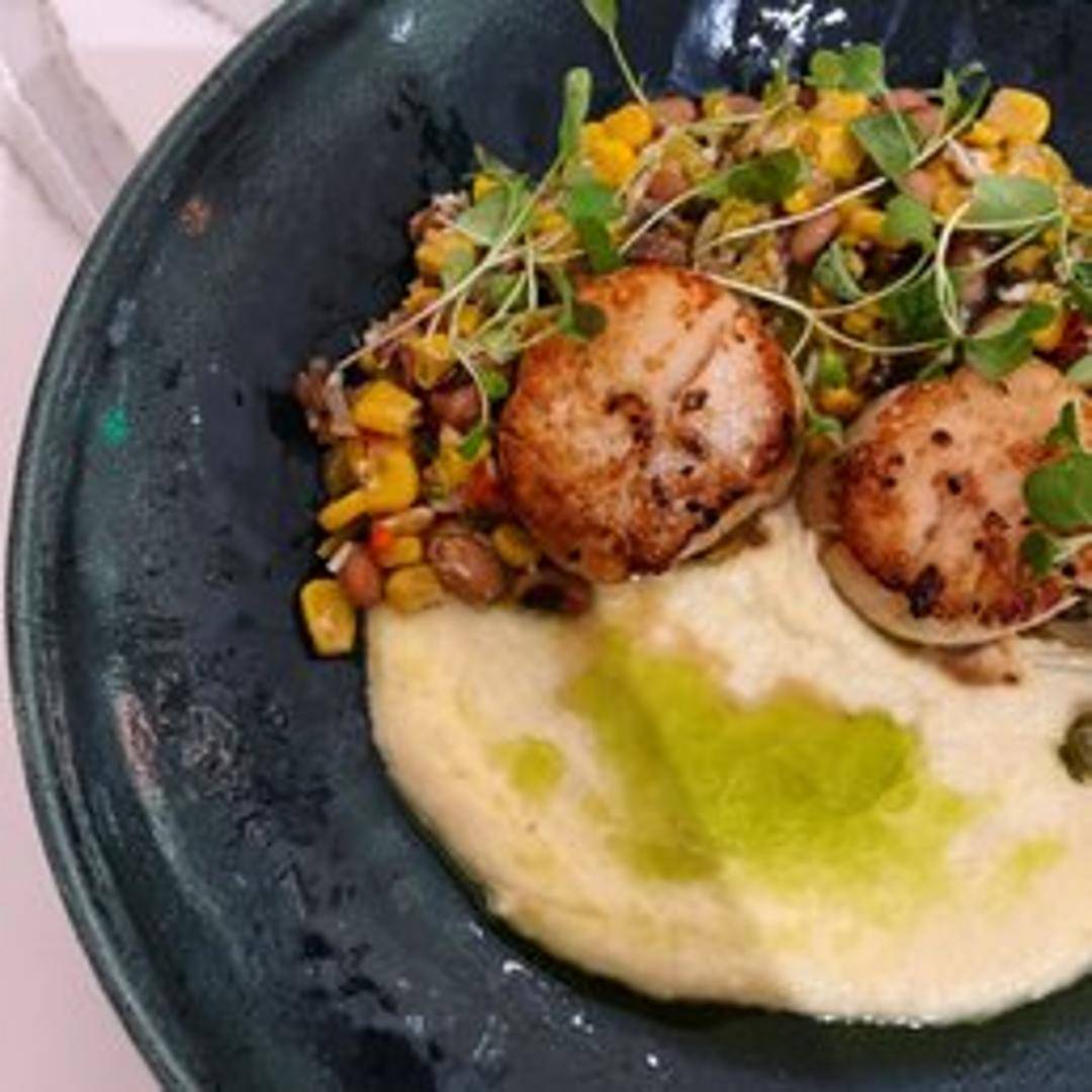 Perfectly seared, tender sea scallops, caramelized to a golden-brown perfection, showcasing their natural sweetness. Delicately plated with a vibrant lemon-butter sauce, asparagus spears, and a creamy parmesan risotto for an exquisite dining experience.