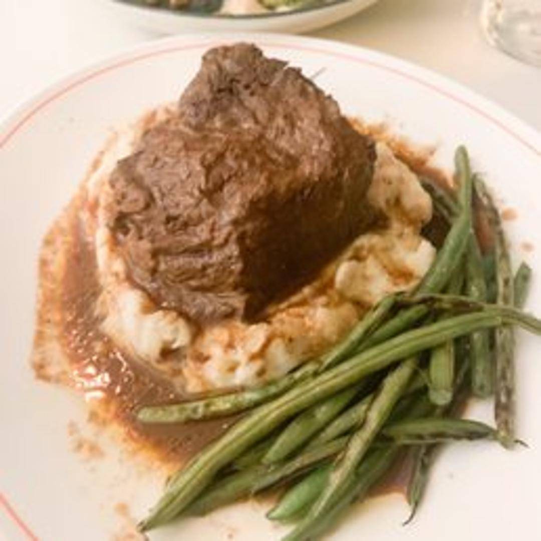 Tender, slow-braised beef short rib, cooked to fall-off-the-bone perfection and glazed in its own rich, aromatic jus. Accompanied by creamy mashed potatoes and seasonal roasted root vegetables.