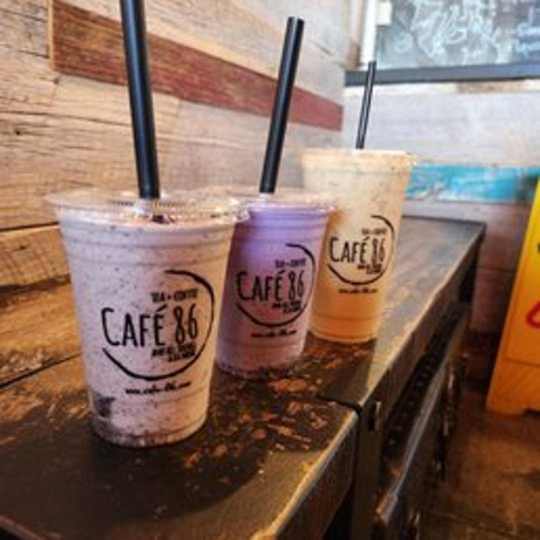 A playful blue-colored drink, likely a milkshake or blended beverage, featuring cookie flavors and potentially cookie pieces blended in for a sweet and fun treat.