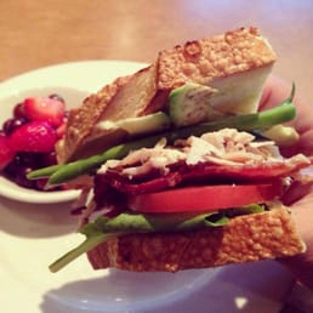 Smoked turkey, ham, bacon, cheddar cheese, lettuce, tomato, and mayonnaise on toasted multi-grain bread.