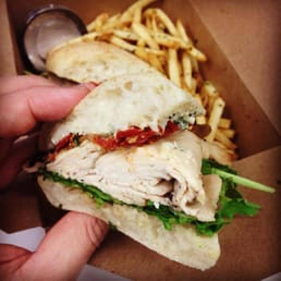 Grilled chicken breast, goat cheese, roasted red peppers, arugula, and balsamic glaze on ciabatta bread.