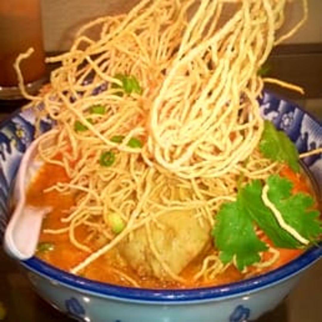A specific and likely signature version of Khao Soi curry, featuring egg noodles in a coconut curry broth, topped with crispy noodles, pickled mustard greens, red onions, and your choice of protein, prepared in a style unique to Cafe De' Bangkok.
