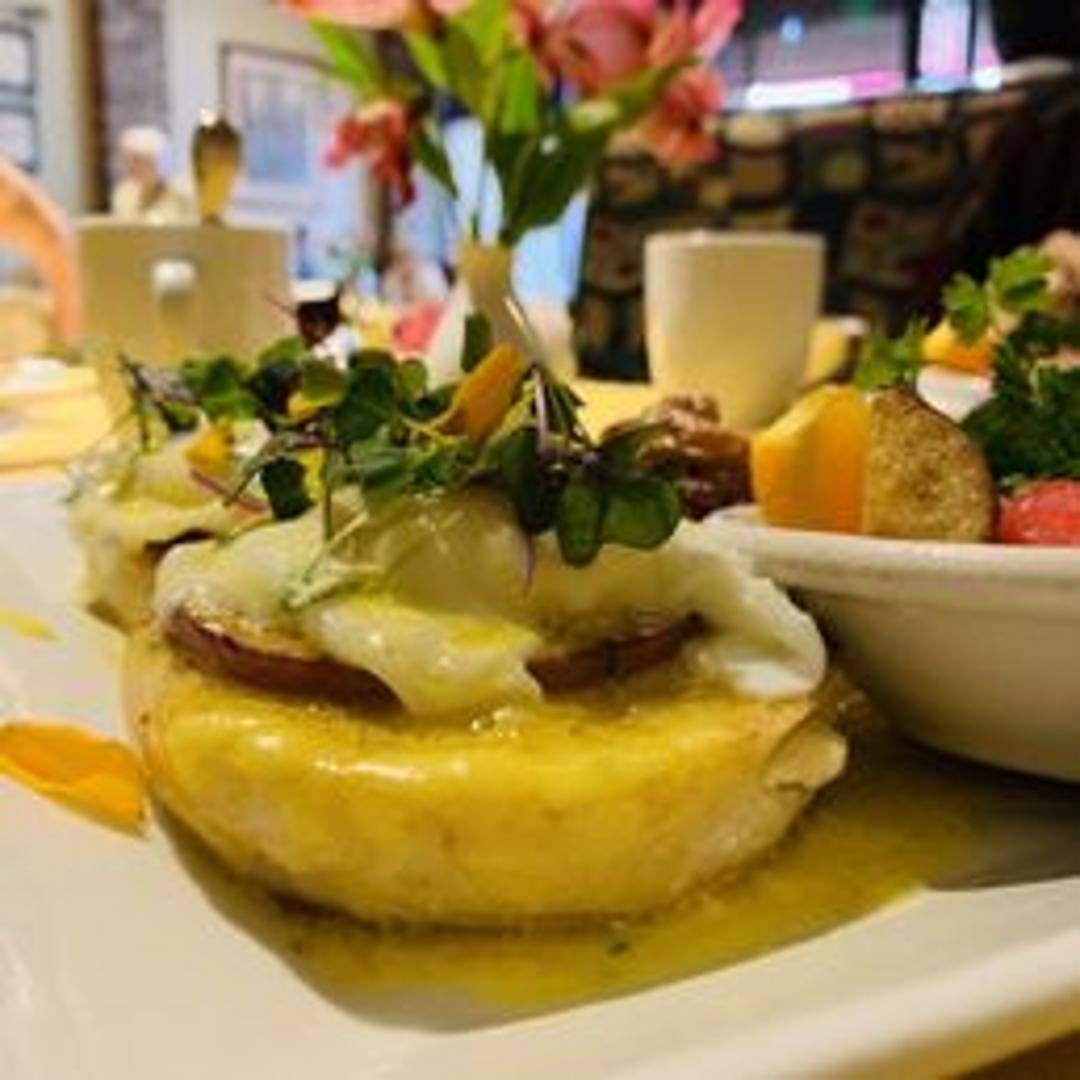 Two poached eggs served atop toasted English muffins with Canadian bacon and smothered in a classic hollandaise sauce. Served with a side of breakfast potatoes.