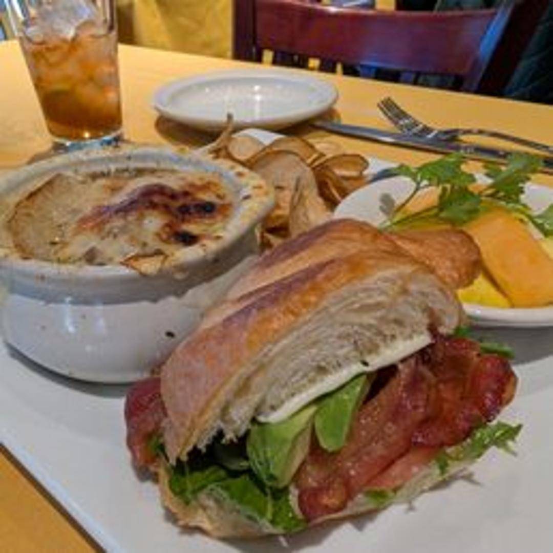 Classic French onion soup featuring caramelized onions simmered in a rich beef broth, topped with a toasted baguette slice and melted Gruyere cheese.
