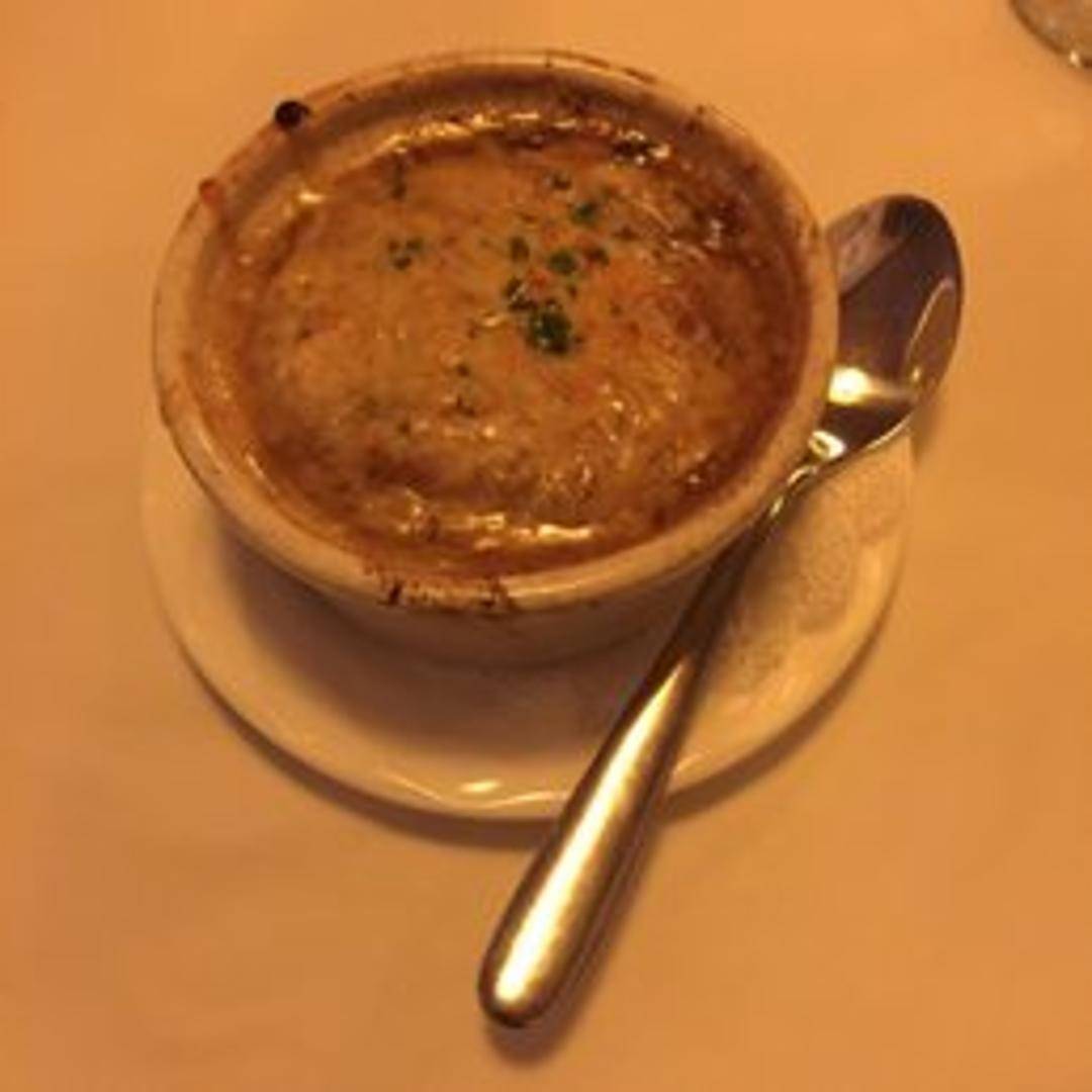 Classic French onion soup made with caramelized onions in a rich beef broth, topped with a toasted baguette slice and melted Gruyere cheese, then baked until bubbly and golden brown.