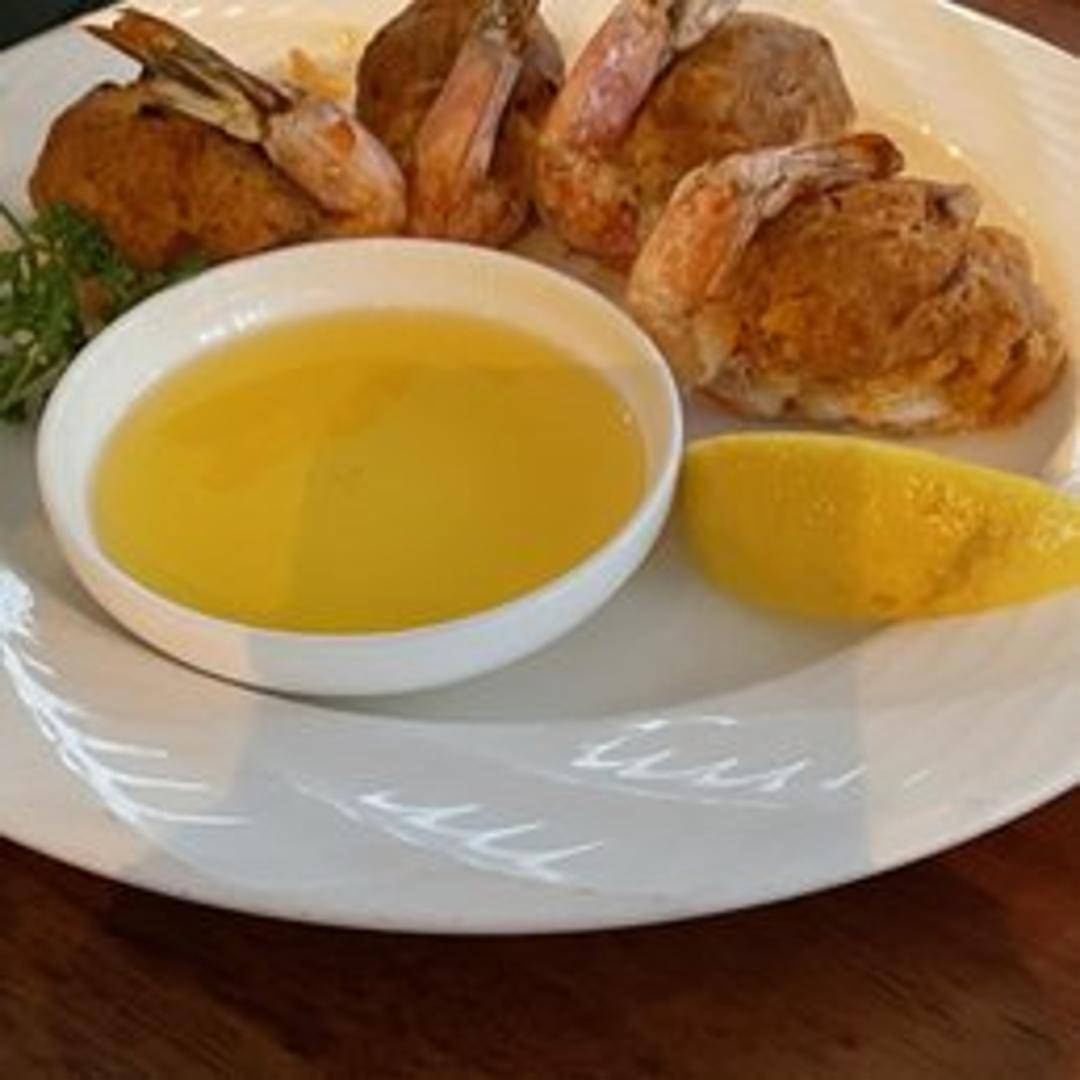 Jumbo shrimp filled with a flavorful breadcrumb stuffing, often containing crab meat, herbs, and seasonings, then baked until golden brown and tender.
