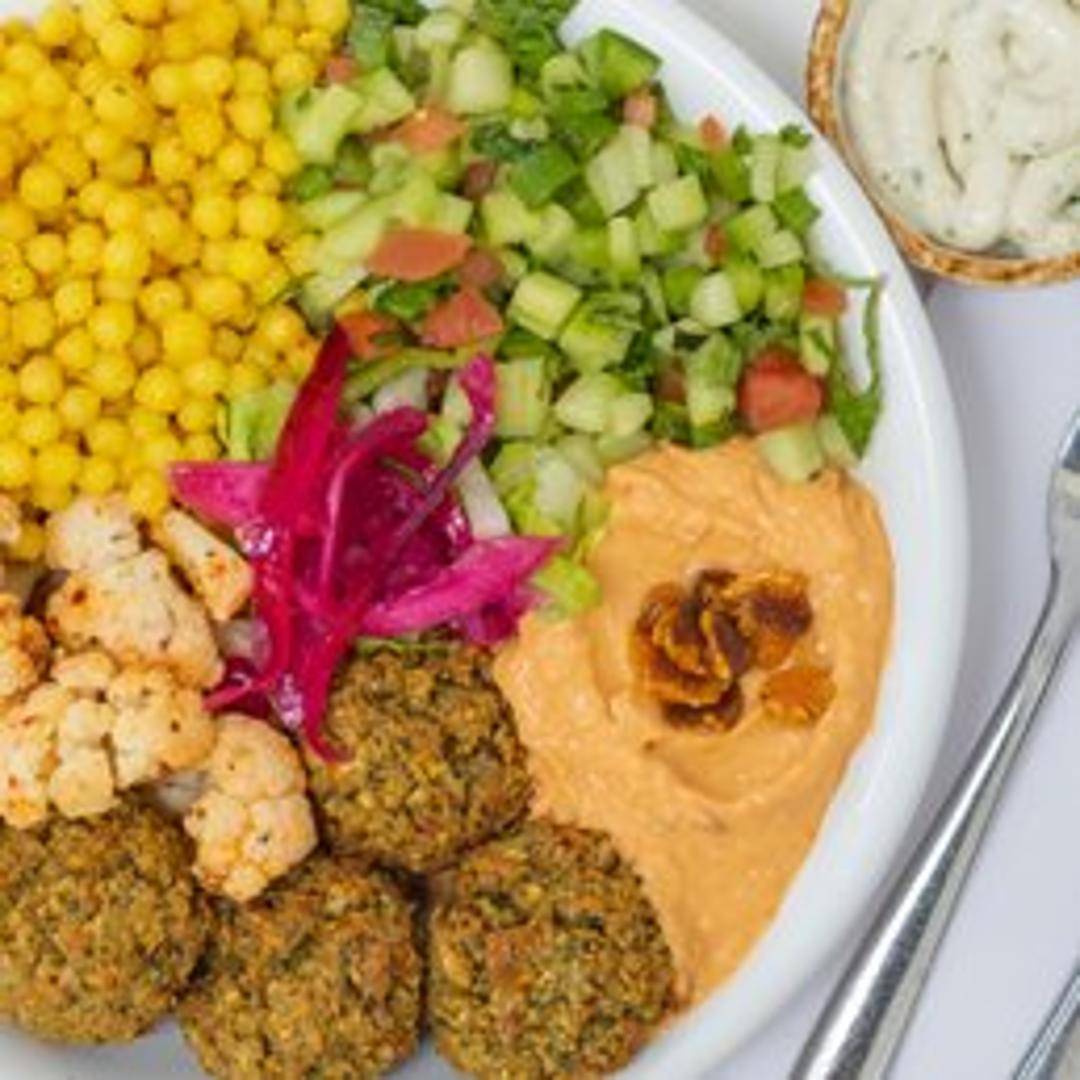 A hearty and wholesome bowl centered around our perfectly crispy, golden-brown falafel. Served over a nourishing bed of fluffy quinoa or couscous, with fresh mixed greens, pickled turnips, cucumbers, and ripe tomatoes, all drizzled with a creamy tahini sauce.