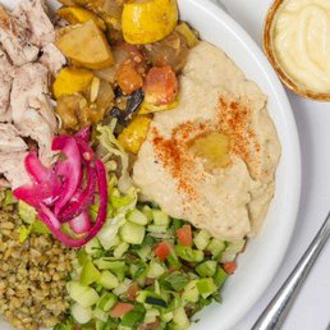 A wholesome and satisfying bowl combining tender, grilled chicken breast with a hearty base of mixed grains such as quinoa and farro, fresh seasonal vegetables, and a flavorful dressing, creating a perfectly balanced and nutritious meal.