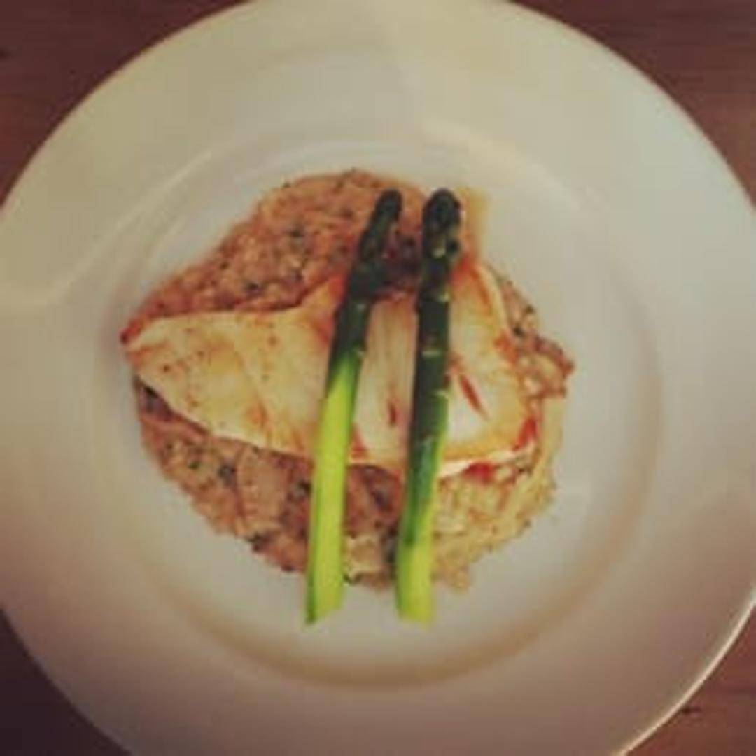 Creamy risotto featuring perfectly cooked sea bass, infused with delicate flavors and a touch of umami.