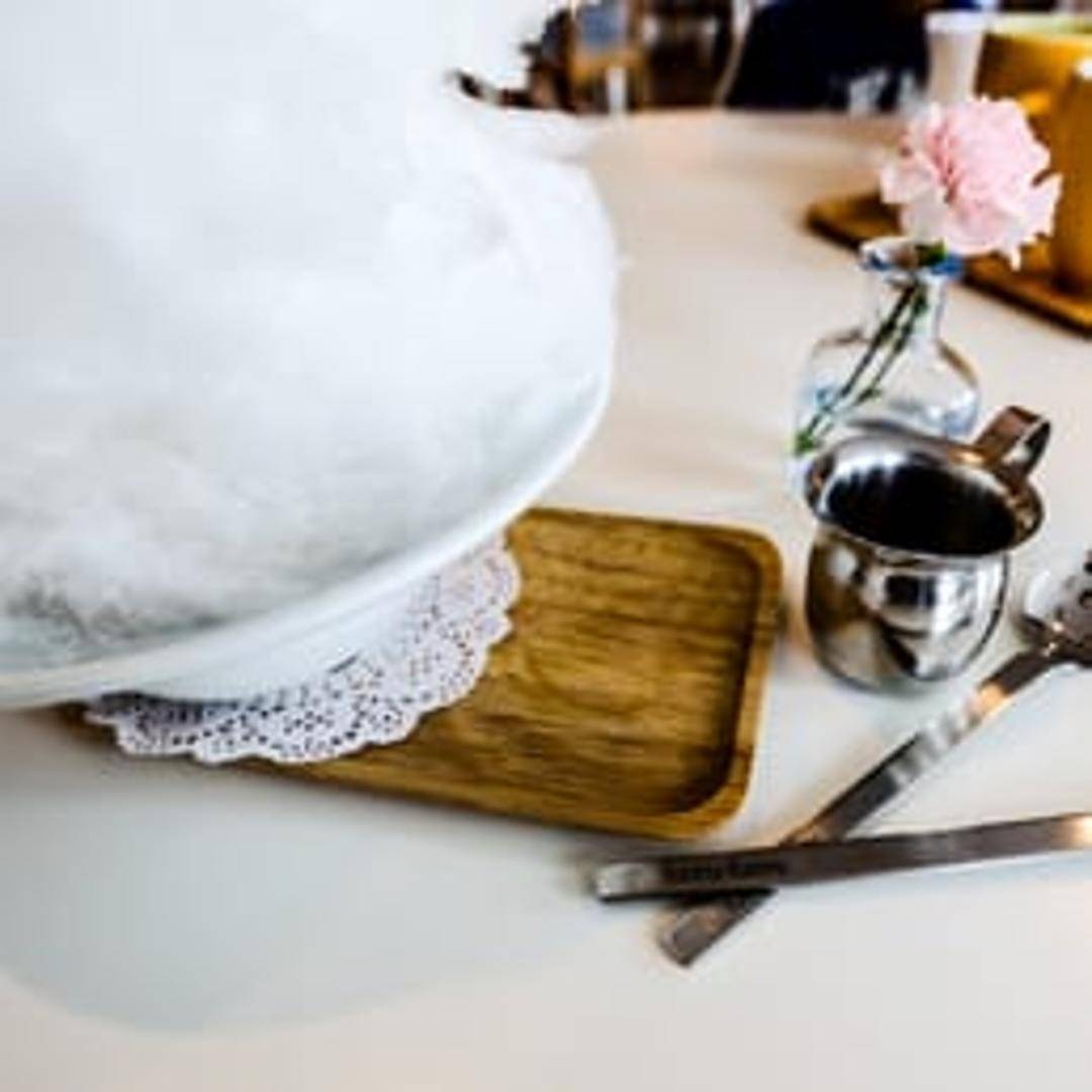 A delightful dessert featuring a scoop of creamy vanilla ice cream 'drowned' in a shot of hot espresso, creating a delightful contrast of temperatures and flavors, topped with shaved ice.