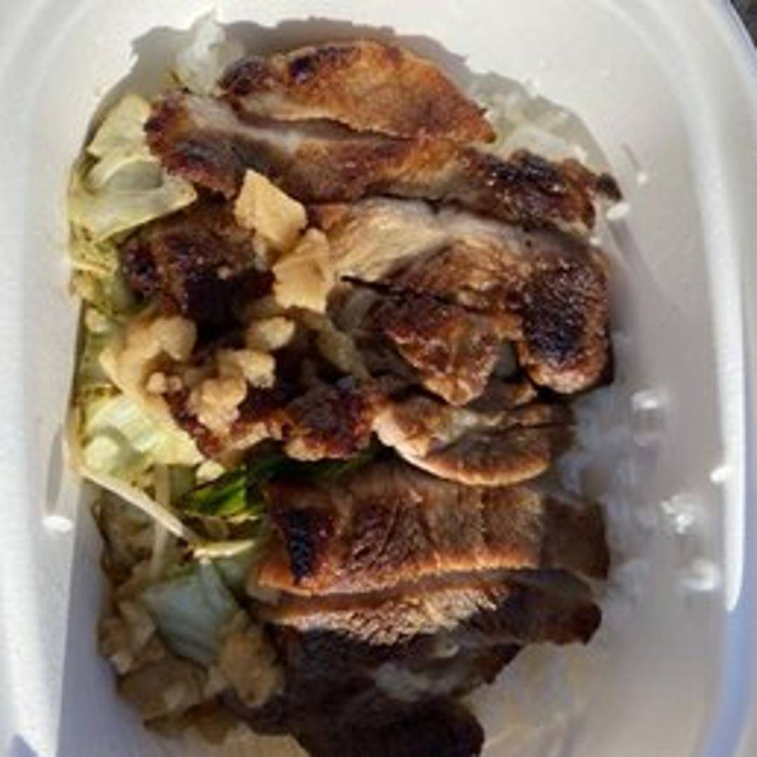 A hearty and robust Japanese-style rice bowl, known as 'donburi,' featuring a generous portion of expertly prepared savory ingredients layered over a bed of perfectly steamed rice. This satisfying dish offers a rich umami profile and a comforting, substantial meal experience.