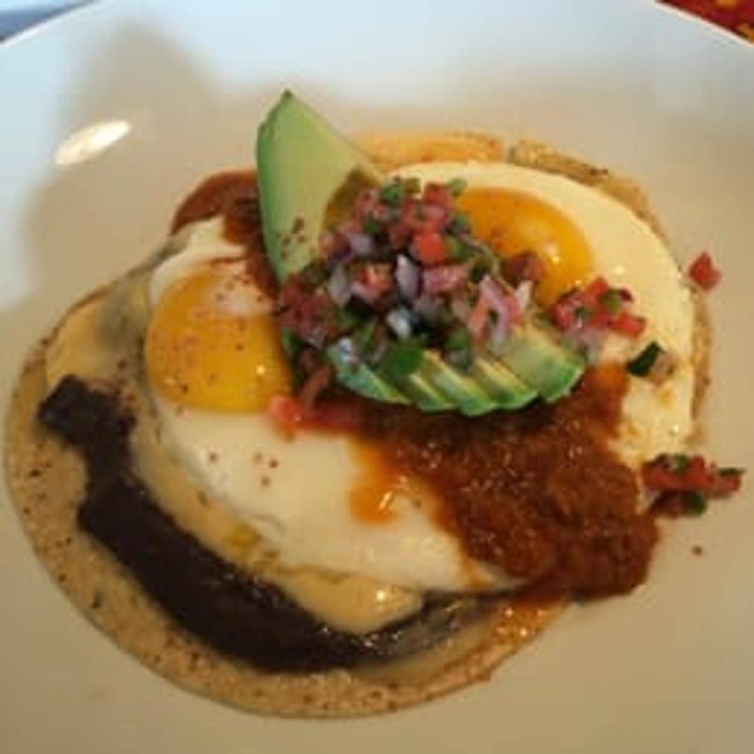 A flavorful dish of lightly fried tortillas topped with fried eggs, beans, salsa, and other accompaniments. A zesty start to your day.