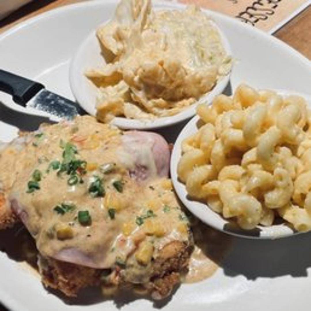 Experience a culinary classic with our 'Chicken Cordon Bleu'. A tender, juicy chicken breast is carefully pounded thin, then generously stuffed with savory smoked ham and creamy Swiss cheese. Expertly breaded to a golden crisp and perfectly cooked, this dish offers a delightful blend of textures and a rich, satisfying flavor profile, served with your choice of our complementary sides.