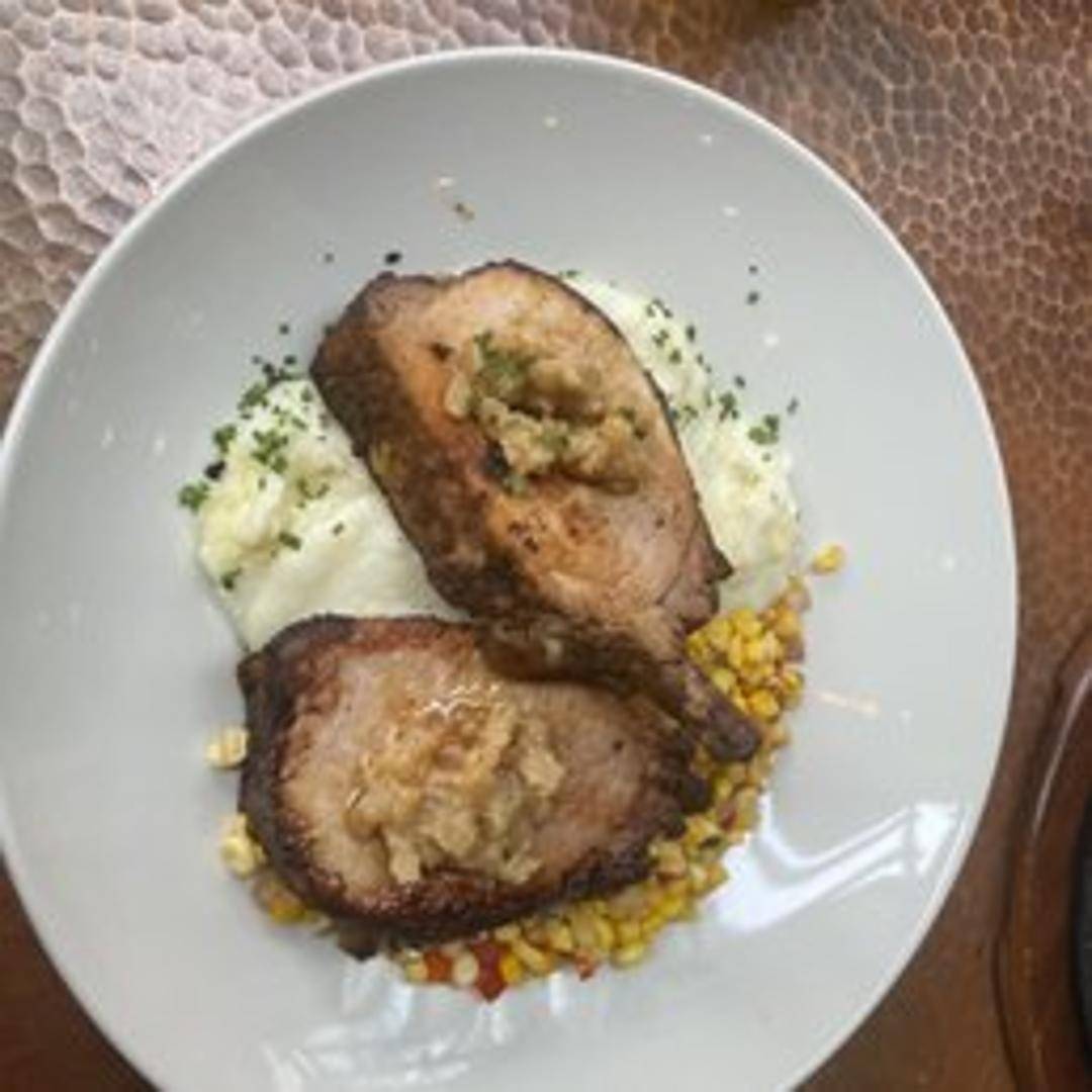 A generously thick-cut pork chop, promising a substantial and flavorful serving. Expect a juicy interior and possibly a seared or grilled exterior.