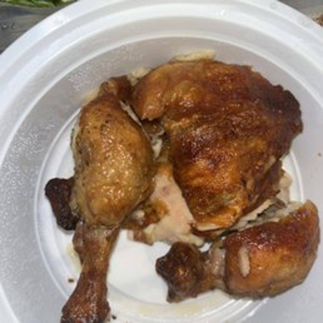 Slow-roasted chicken, seasoned with a blend of herbs and spices, resulting in juicy and flavorful meat with crispy skin.