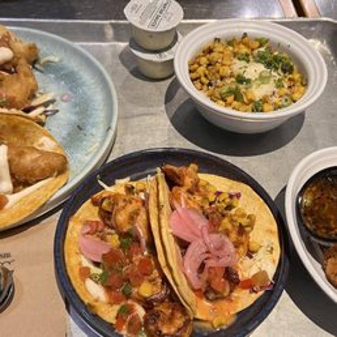 Two tacos with battered and fried shrimp, shredded cabbage, pico de gallo, and a creamy cilantro dressing.