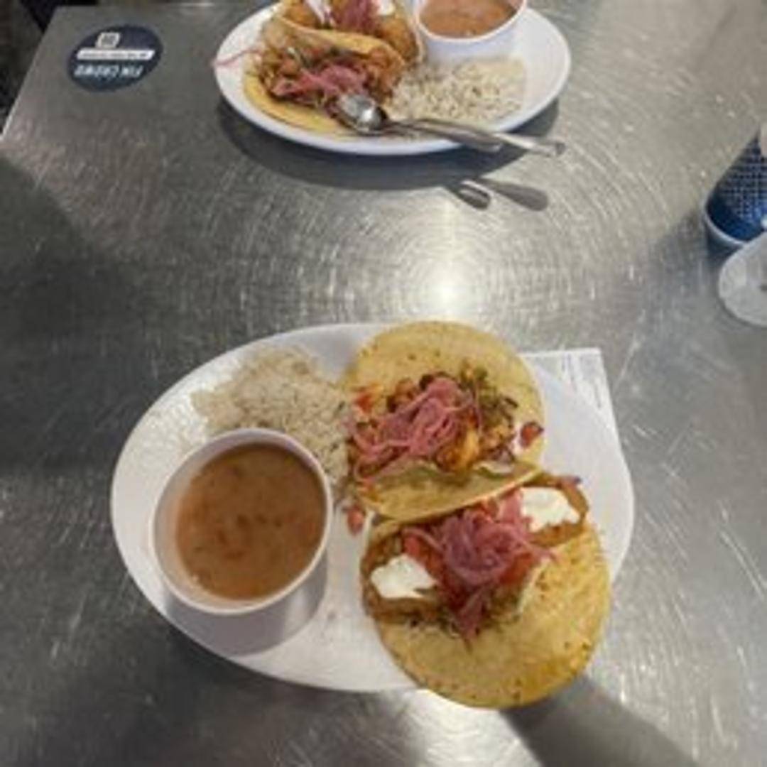 Tacos filled with shrimp seasoned with Cajun spices, typically accompanied by toppings like cabbage slaw, cilantro, and a spicy sauce.