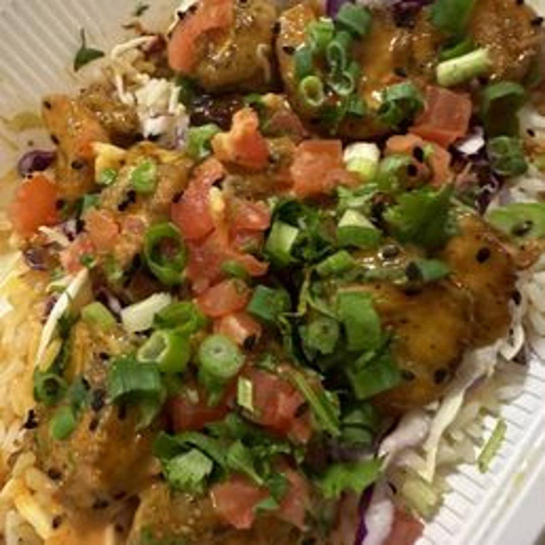 Crispy shrimp tossed in a spicy dynamite sauce, served over rice. Includes avocado, seaweed salad, and sesame seeds.