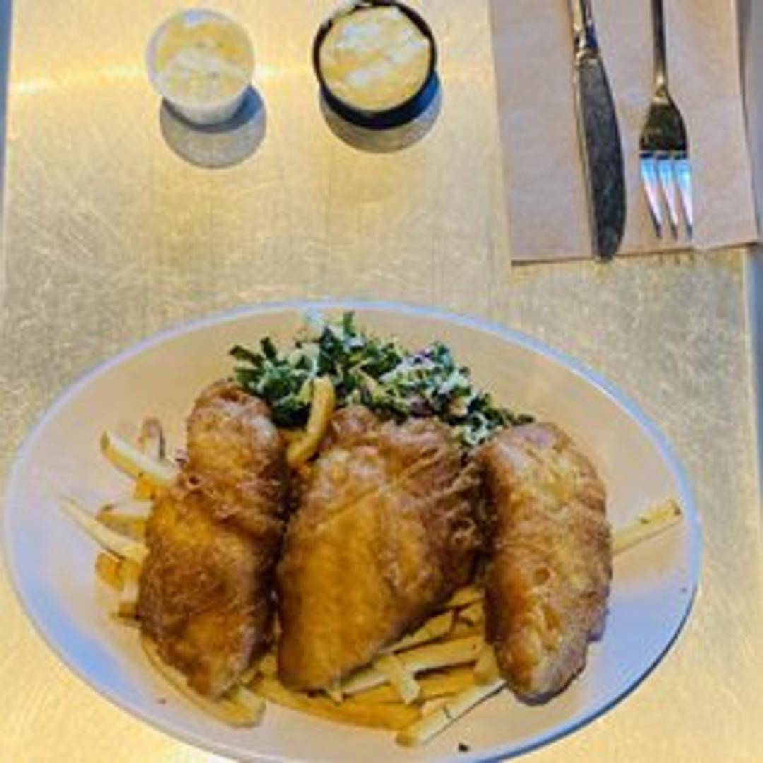 Crispy battered fish fillets served with golden-brown french fries. Accompanied by tartar sauce for dipping. A classic and satisfying seafood meal.