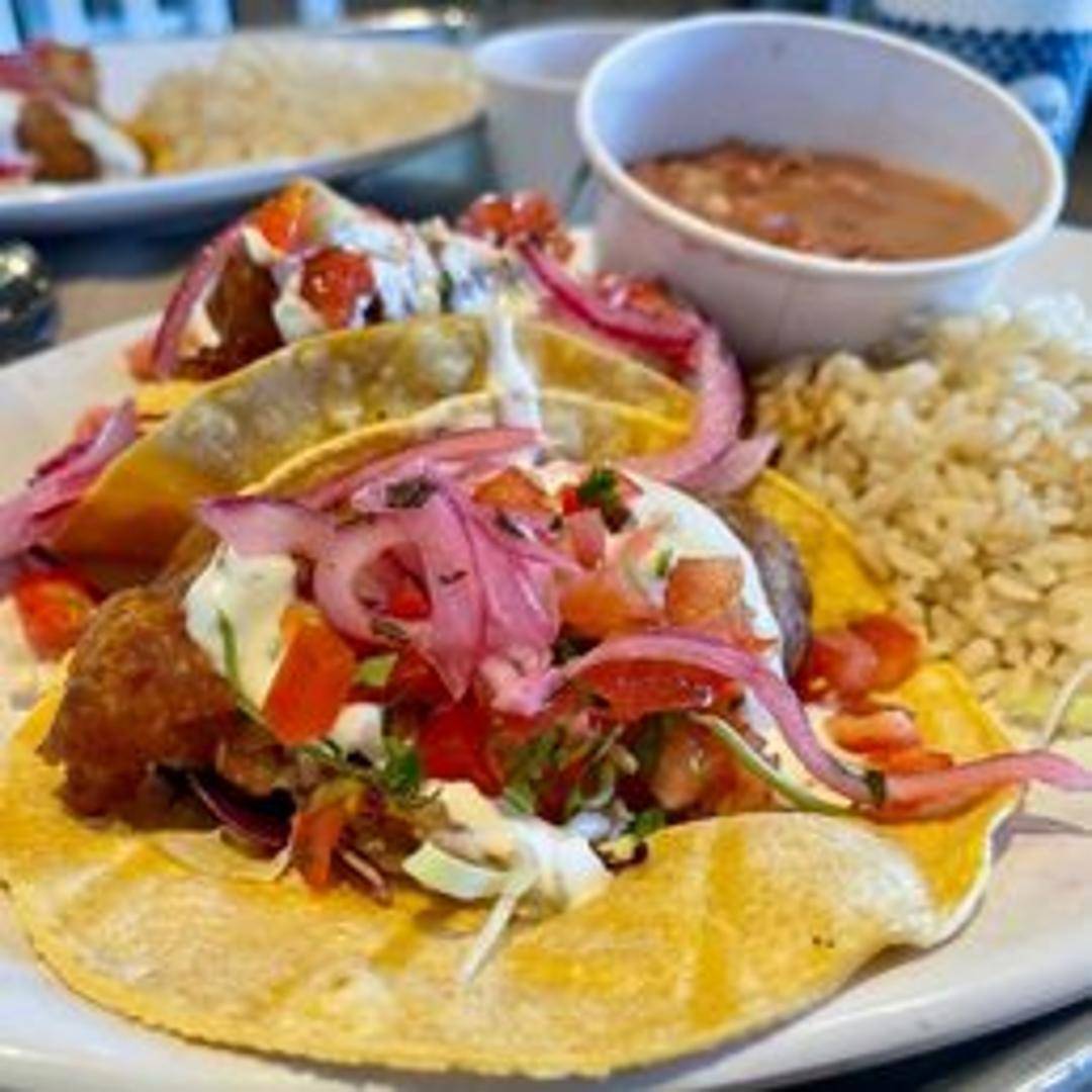 A flavorful combo featuring your choice of two tacos served with a side of rice and beans. Choose from a variety of grilled or crispy fish, shrimp, or other protein options to customize your meal. Topped with fresh toppings and signature sauces.