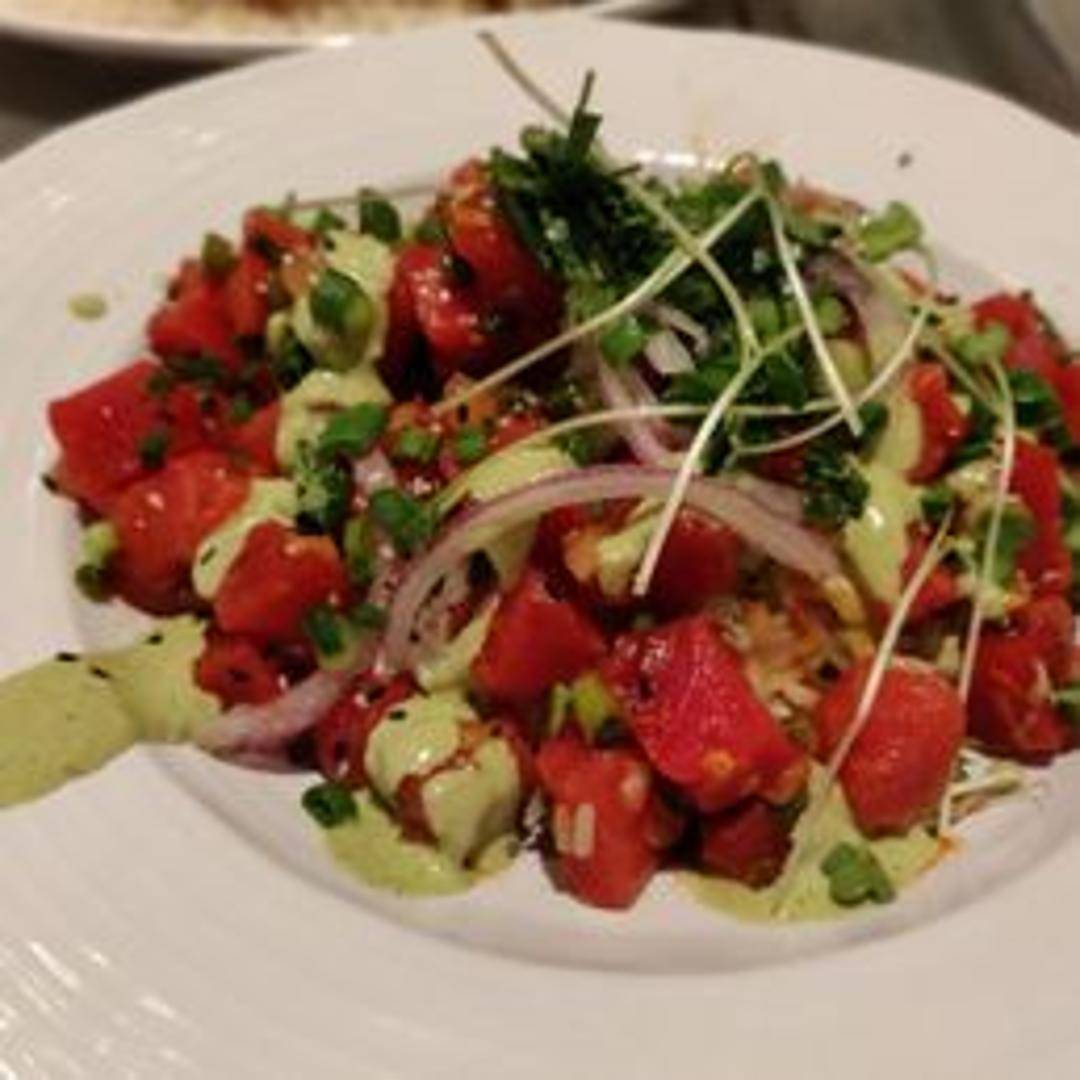 Fresh ahi tuna marinated in a flavorful poke sauce, served over sushi rice with seaweed salad, avocado, edamame, cucumbers, and sesame seeds.