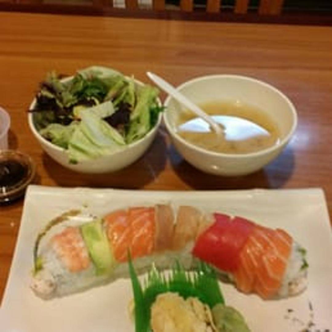 A visually stunning and delicious sushi roll. Imitation crab meat and avocado are rolled inside, while the outside is artistically layered with slices of tuna, salmon, yellowtail, shrimp, and avocado. Served with a side of soy sauce, ginger, and wasabi.