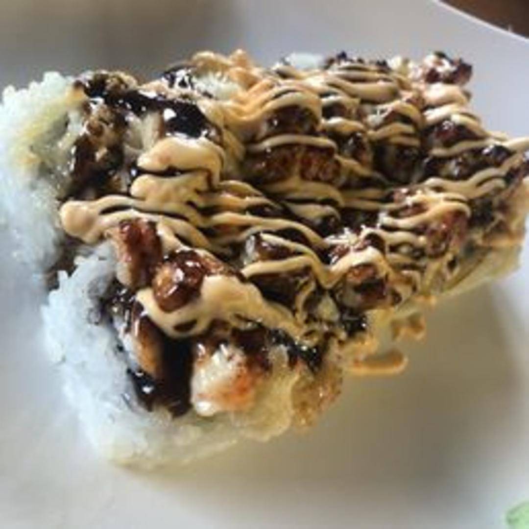 A delectable sushi roll featuring succulent lobster meat, baked to perfection. The roll includes avocado and cucumber, wrapped in seaweed and sushi rice, then topped with a creamy, savory sauce. Garnished with sesame seeds and green onions.